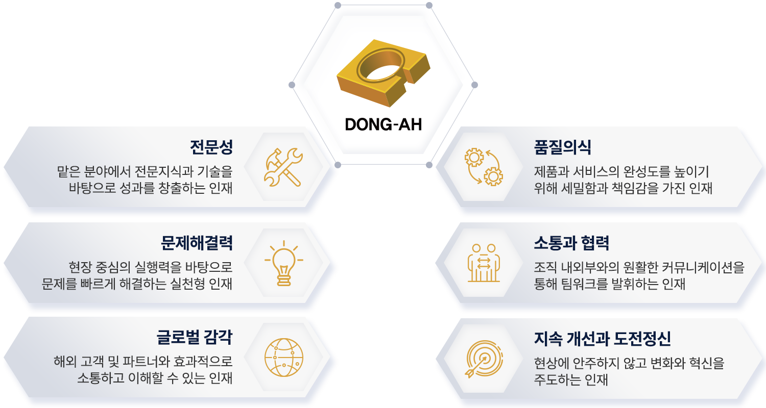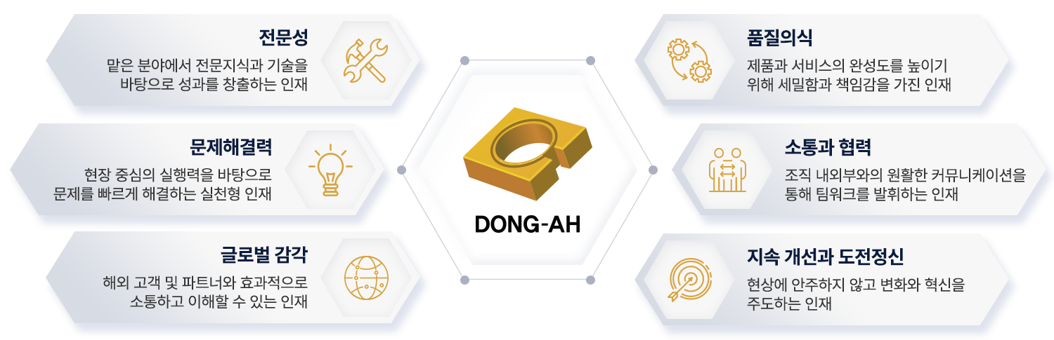 동아는 기술 혁신을 주도하고, 품질을 최우선으로 하며, 현장의 문제를 스스로 해결할 수 있는 실행력 있는 인재들이 함께하는 공동체입니다.